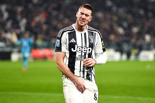 TURIN, ITALY – NOVEMBER 29: Dusan Vlahovic of Juventus FC injured during the Serie A match between Juventus FC and Cagliari Calcio at Allianz Stadium on November 29, 2025 in Turin, Italy. (Photo by Alberto Gandolfo/BSR Agency/Getty Images)