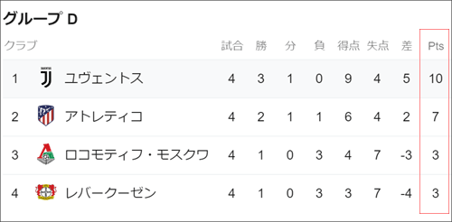 すでに決勝トーナメント進出を決めたユベントスですが、残りの3チームは最後の1枠を争っている状態。まずは各チームの状況を確認して見ましょう。