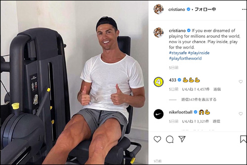 「クリスティアーノ・ロナウドは自主隔離中に筋肉隆々の姿を誇示し、非の打ち所がない状態で写真を撮られた。パートナーのジョージナ・ロドリゲスが買い物に出かけた間、日光浴に興じた」と報じられていた」