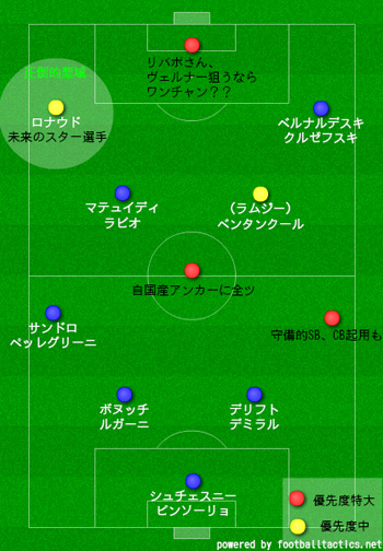次に「4-3-3への適合性」ですが、これはサッリが4-3-3を好んでいるのだから仕方がありません。むしろフロント主導で魅せるサッカーに転換しようとしている以上、しっかりサッリ好みの補強を進めてあげて欲しい所です。扱いづらいスター選手獲得による新規ファン増加と、統率の取れた魅せるサッカーによるファン獲得。相反する戦略を並行してやってて大丈夫か?となっていますが、どちらかが破綻するのではないかと心配でなりません(笑)。(一番簡単なのは前者の方で、ロナウドを活かせるチームを組むべきだと…)