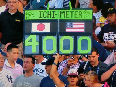本家アメリカのイチメーターを掲げるエイミー・フランツさん。イチロー選手のヒット数をシーズン通じてカウントしていきます。