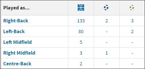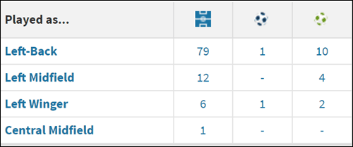 こちらも同じくTransferMarktの記録になり、センターバックでの出場は「わずか2試合」となっていますが、これまでの監督が4バックを起用していた為に上記の数字になっております。結局のところ「4バックの2センターは無理だけど、3バックの一角なら大丈夫」と言う事です。たぶん…。