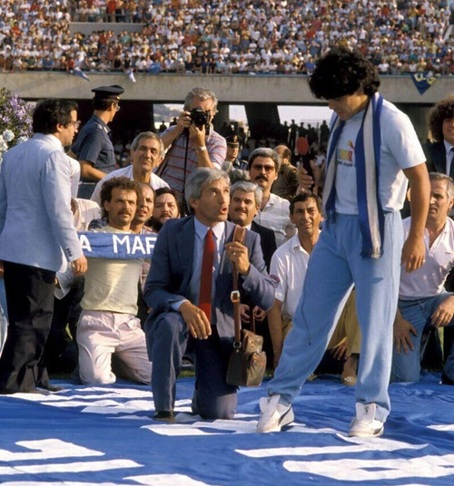 マラドーナが来るまで、ナポリは中位から残留圏を争う弱小クラブだったのが、彼の加入でいきなり黄金時代を迎えるわけですね。そこでのナポリの人々の熱狂。その中心にいるマラドーナ。