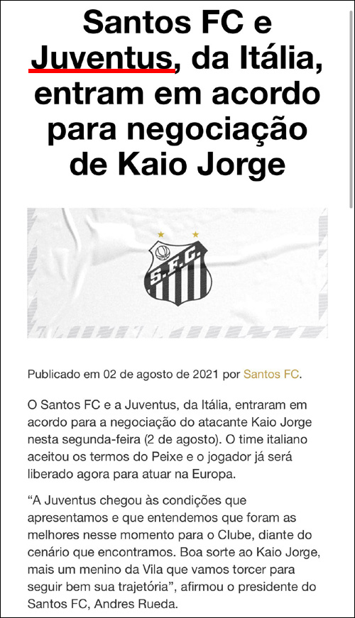 また契約内容については2026年6月までの5年契約で、年俸は250万ユーロ(+ボーナス最大150万ユーロ)の説が濃厚。更にジョルジュ・カイオがユベントスから移籍する際には、その額の5%を追加でサントスに支払うとも言われています。この辺については正式発表されたものではなく「憶測」の域を越えませんが、Nocolo Schiraさんの発言が元になりますので、もし違った場合はNicolo Schiraさんに文句を言って下さい。間違っても編集長に矛先を向けないように。