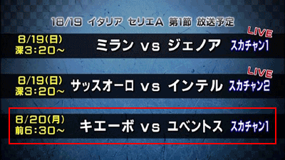 目玉選手であったチンピラーロ移籍により、スカパーのユベントスの開幕戦は録画放送に回される事になりました(試合は8月19日のAM1:00キックオフ)。