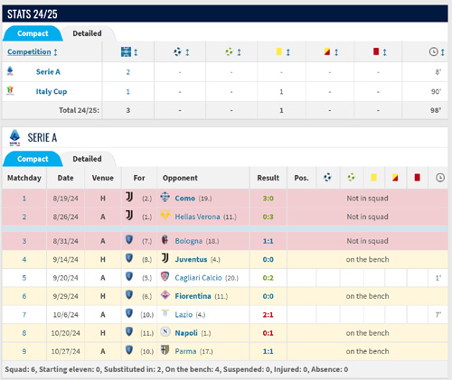 セリエAでは2試合で出場8分。さすがですわ。