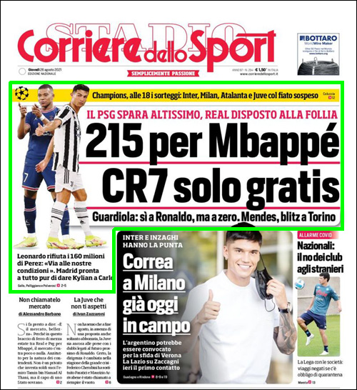 (Corriere)エムバペは2億1500万ユーロ、ロナウドはフリー